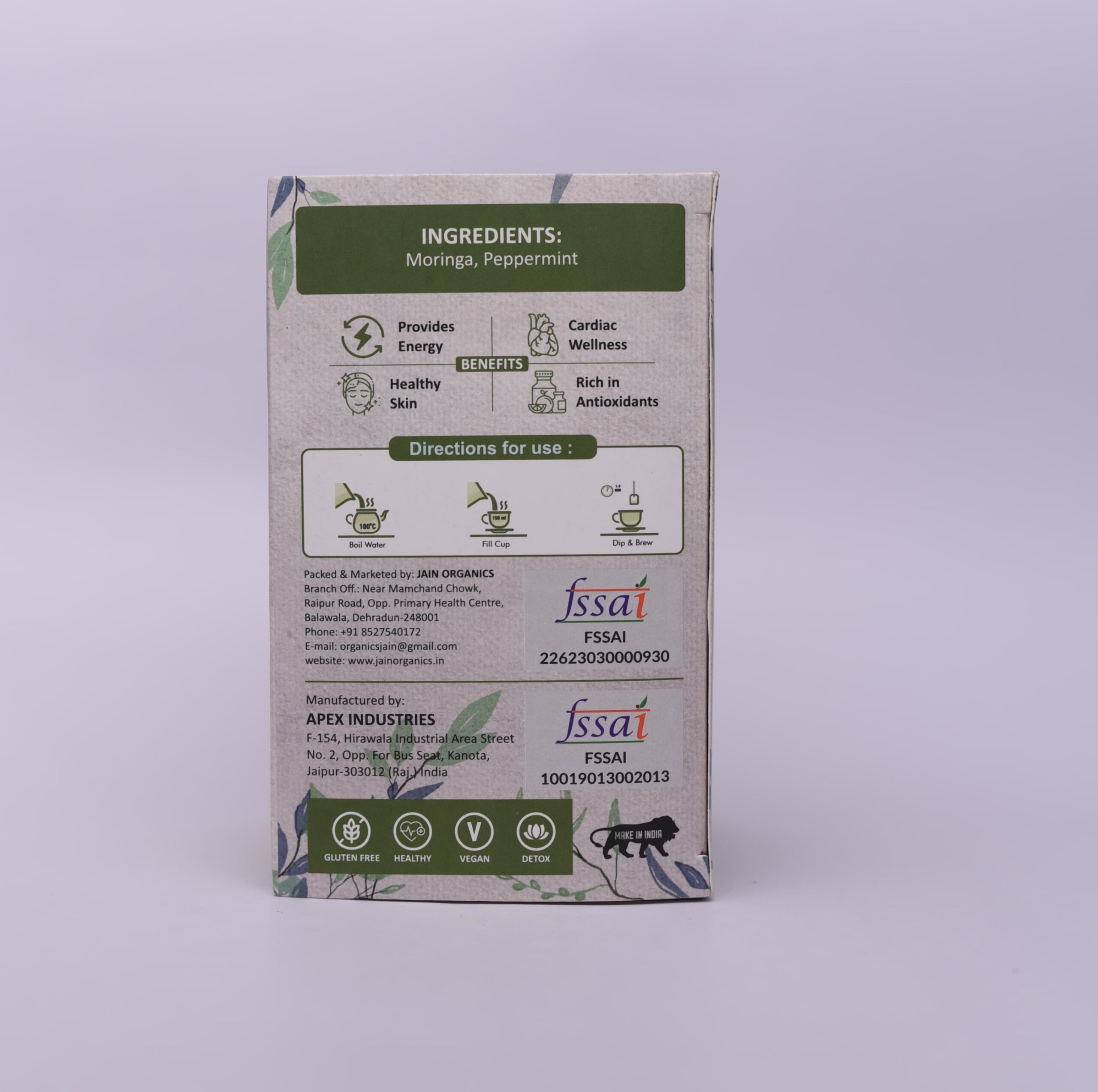 Jain Organics Moringa Pepper Mint Tea is made with moringa leaves. Green Tea leaves are rich a group of Antioxidants called Polyphenols and Moringa leaves are rich in a group of antioxidants called Flavonoids. The combination of these leaves in a single tea bag makes it a favorite Morning wake up refreshment drink.